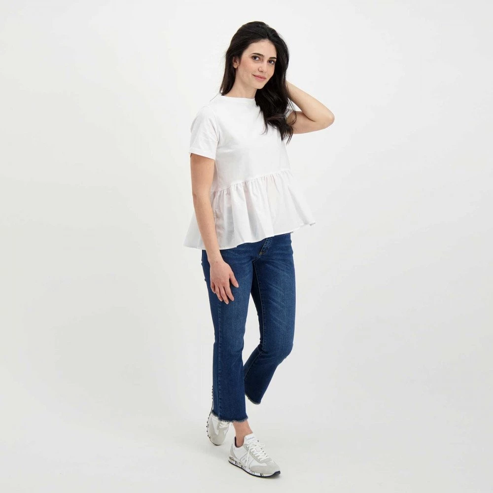 La t-shirt Emme Marella Racer da donna impreziosisce il classico modello girocollo con il fondo a balza, che crea un movimento armonioso e femminile.