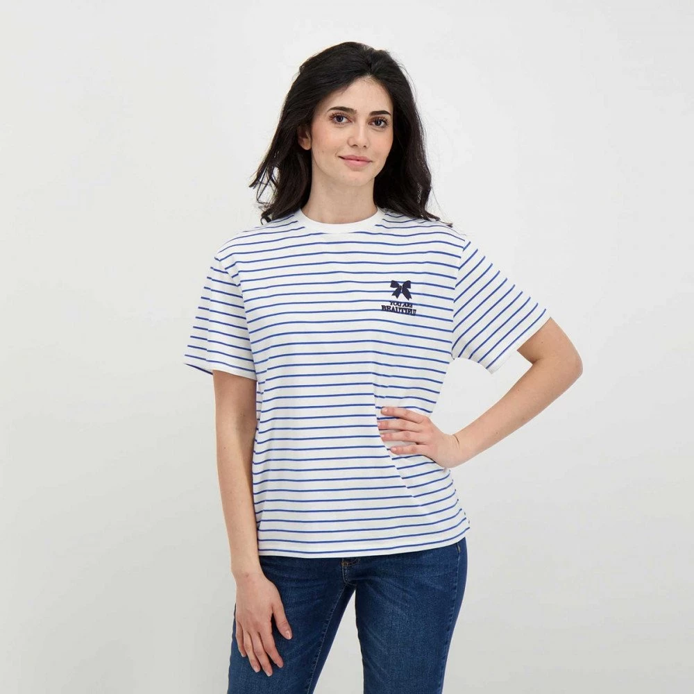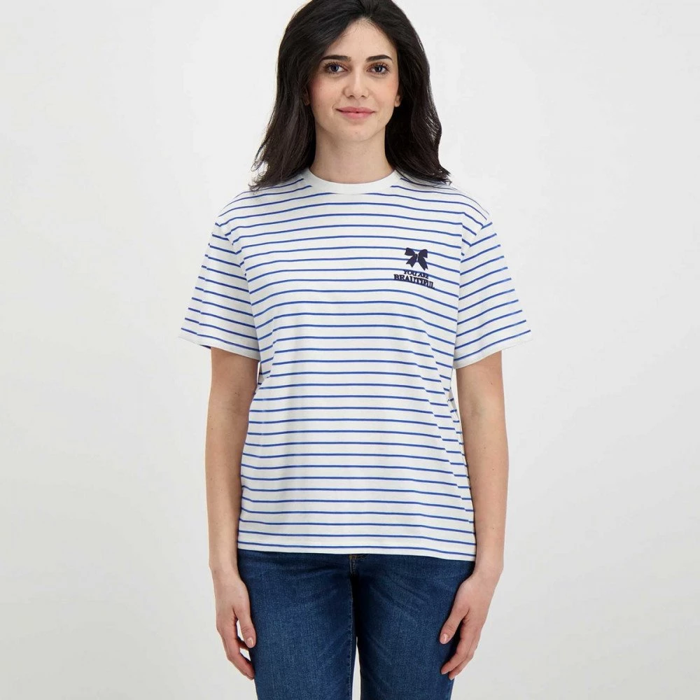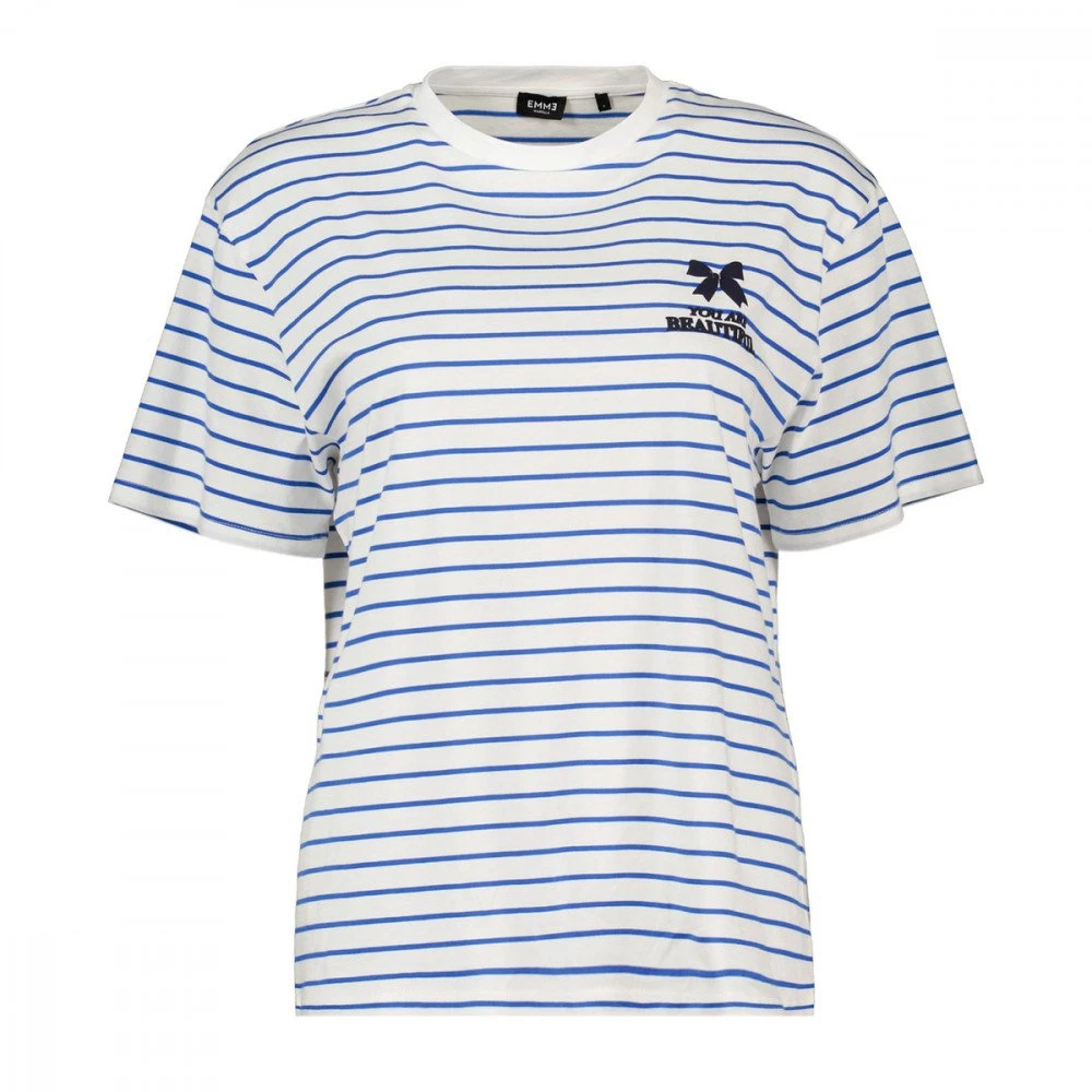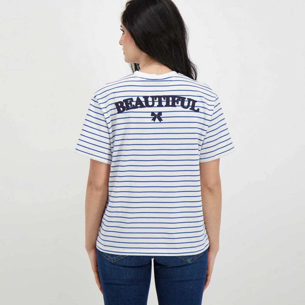 La t-shirt Emme Marella Zulia da donna rivisita l’iconico modello dal design a righe in stile navy, con l’ampia scritta gommata “Beautiful” sul retro, per un tocco vivace e originale.