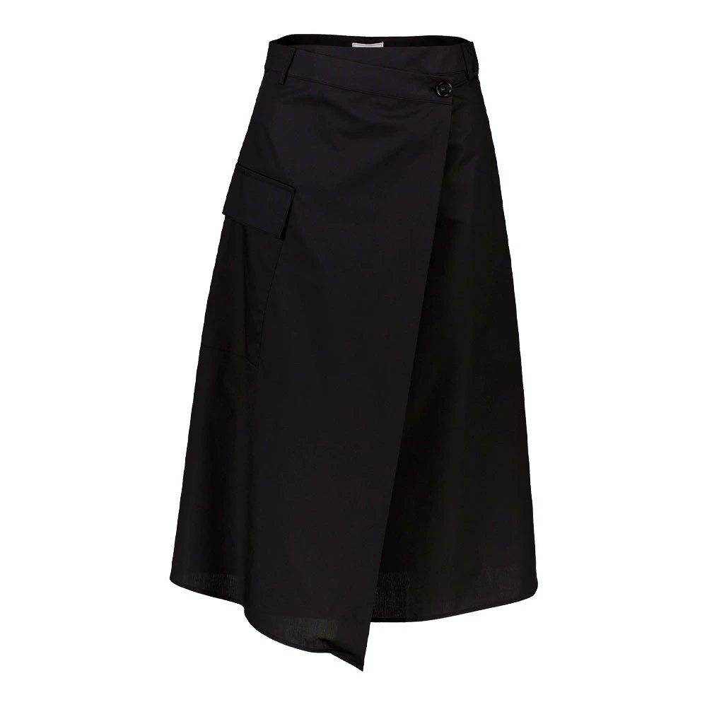 La gonna Woolrich Popline da donna rivisita il classico modello a portafoglio in versione contemporanea con chiusura a bottoni, passanti per cintura e tasca cargo applicata sul lato destro, per un tocco funzionale e di stile.